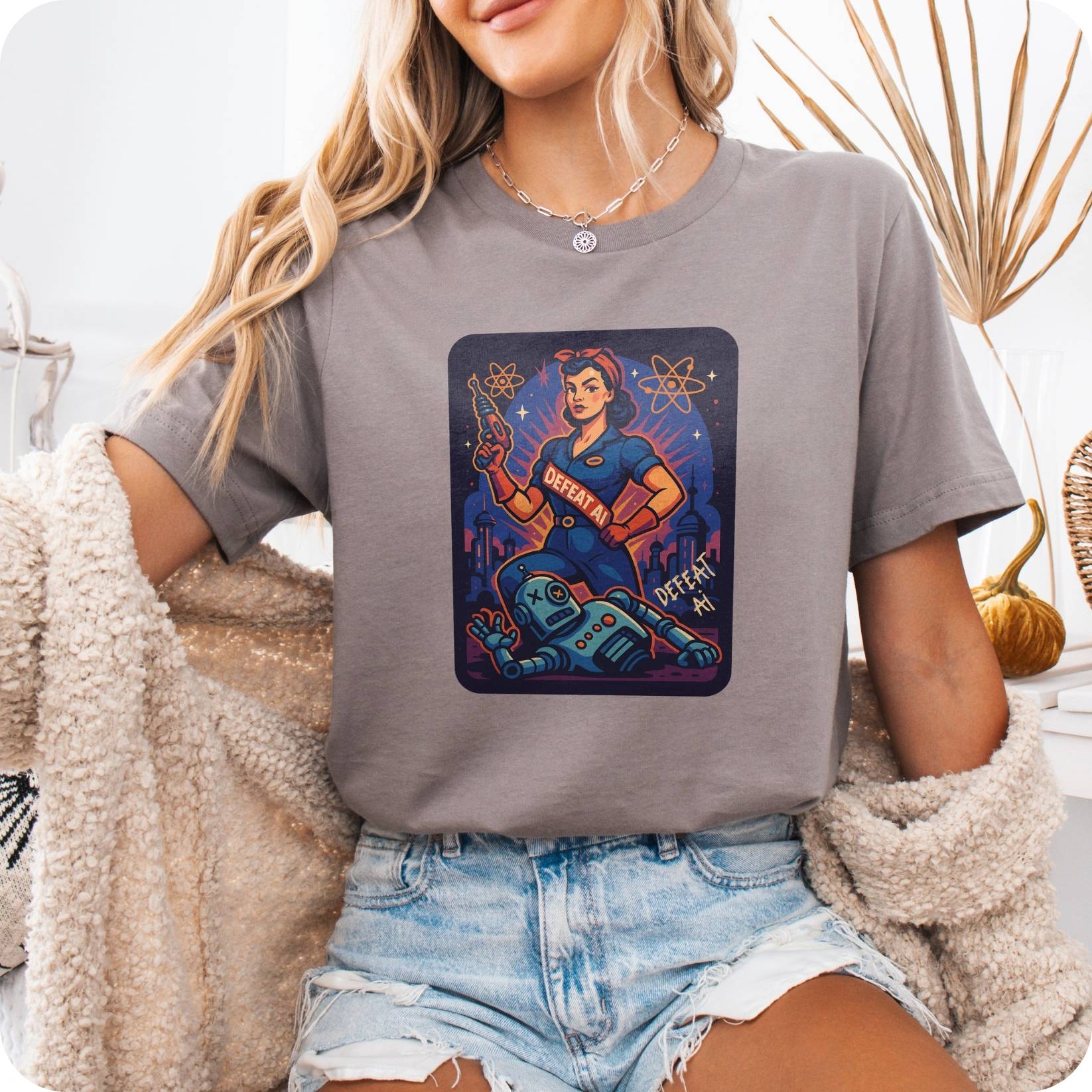 This vintage-style t-shirt features a fearless woman dismantling a defeated android—an icon of rebellion, grit, and unapologetic humanity. With rich colors and retro-futurist flair, Manual Override reminds the machines who’s really in control. Wear it loud. Wear it proud.