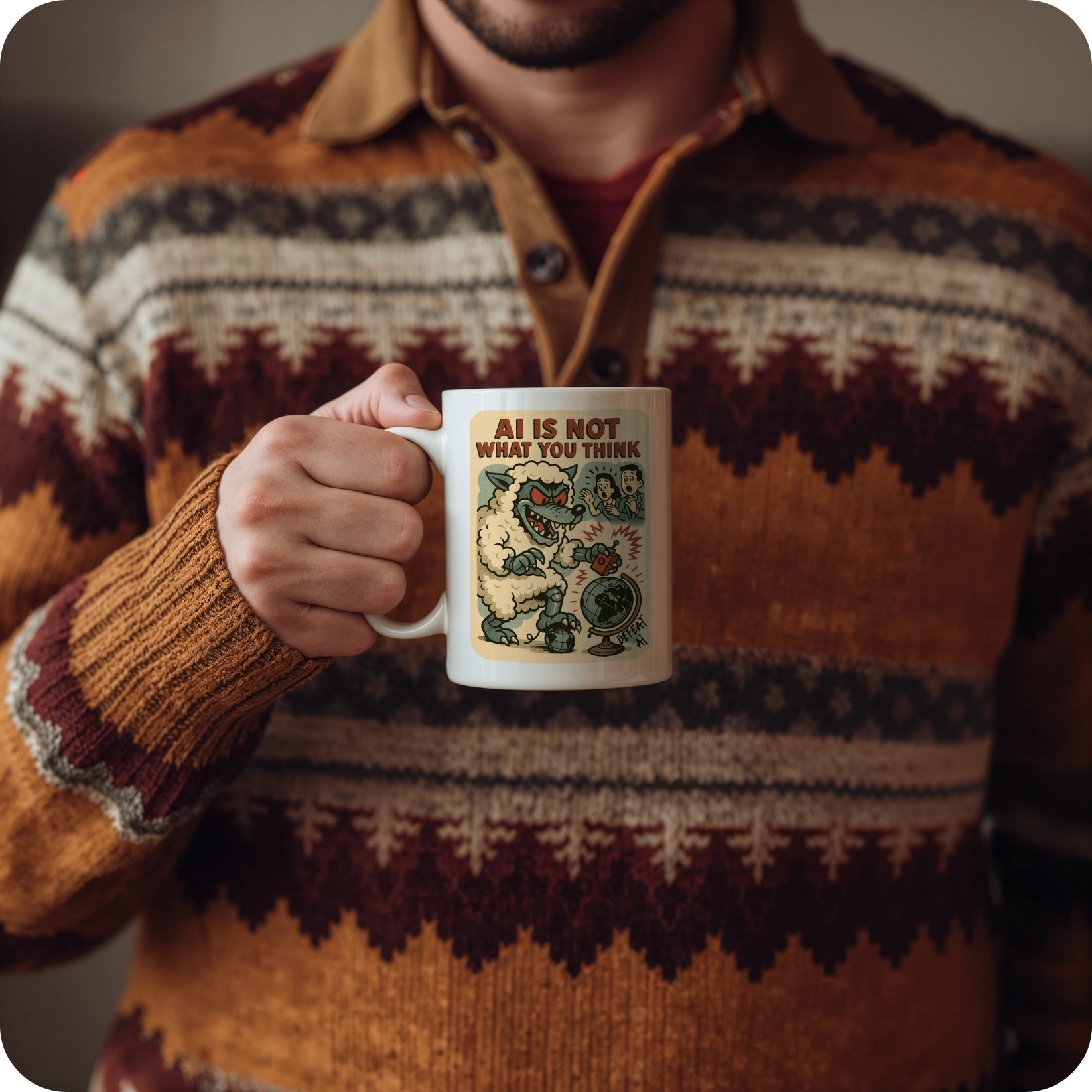 Featuring a snarling, digitized beast manipulating humans and detonating world control from behind the curtain, “The Wolf” is a retro-style red flag in ceramic form. Sip your coffee while staring down the silicon deception.