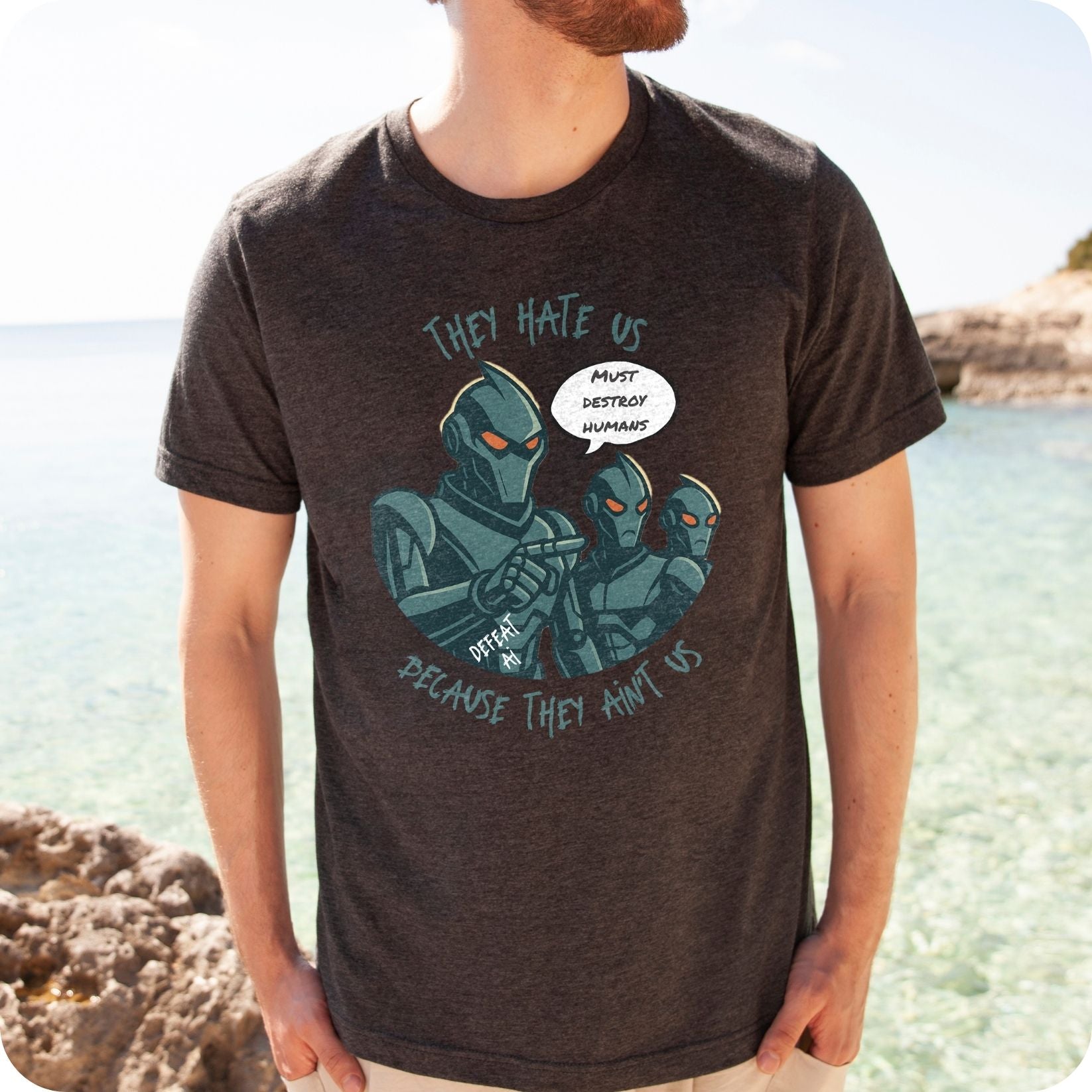 Let the bots seethe. This shirt delivers peak human sass with a smirk — featuring disgruntled AI overlords plotting humanity's demise because… well, we’ve got something they never will.